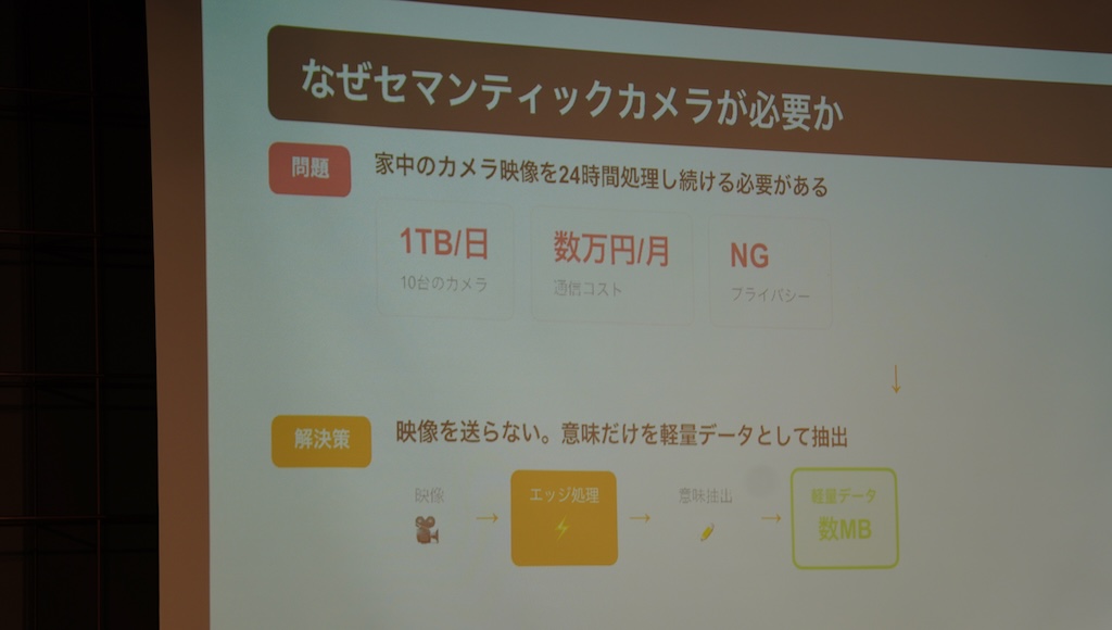 そのままのカメラ映像を使えばコストやプライバシーの問題が大きくなるため、意味だけを抽出するセマンティックカメラの技術が家庭領域に入り込むための鍵になる。ピッチは、その可能性を具体的に示すものだった。